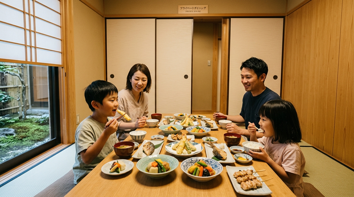 個室での夕食に対応しており、家族やグループでゆっくり食事ができる環境が整っています。